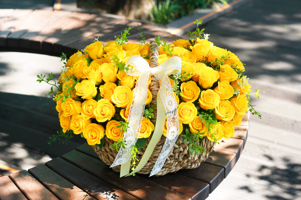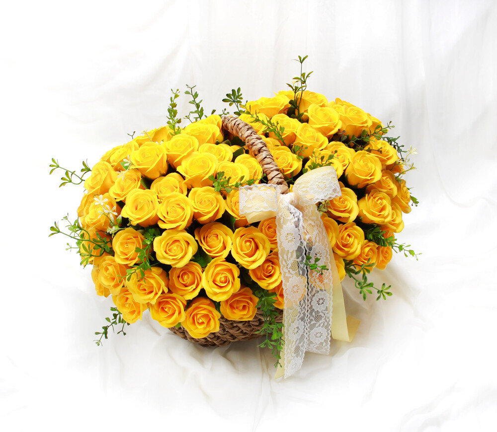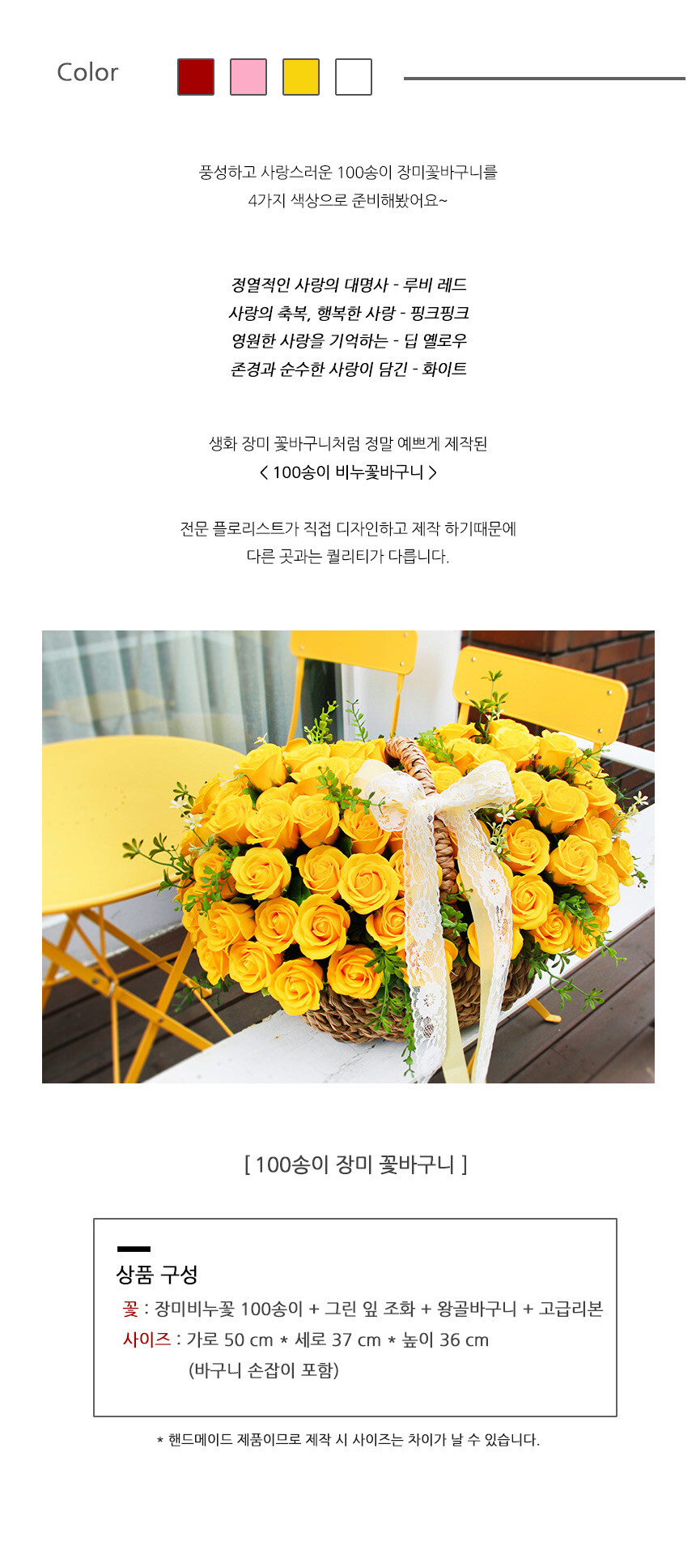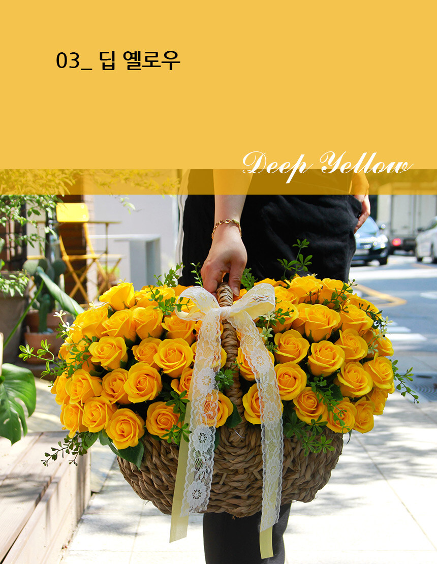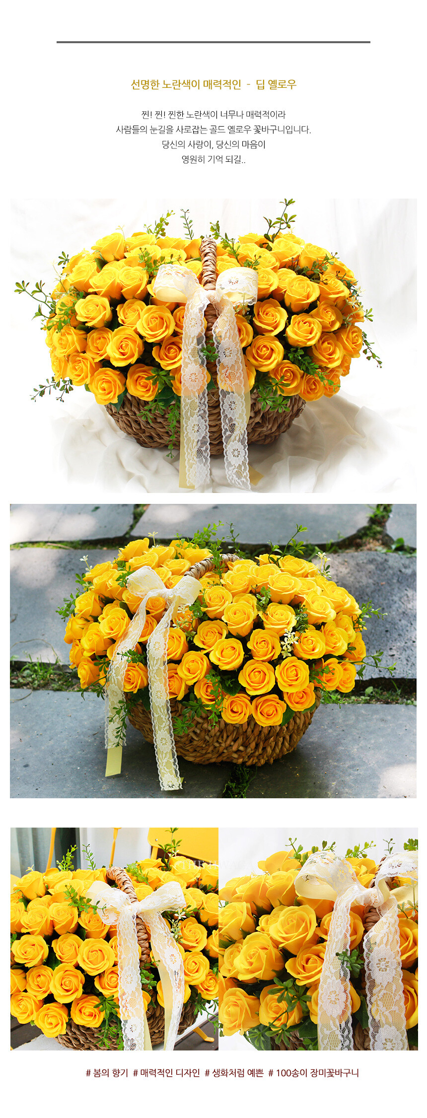 찐! 찐! 찐! 진한 노란색이 너무나 매력적이라 사람들의 눈길을 사로잡는 골드옐로우 100송이 꽃바구니
