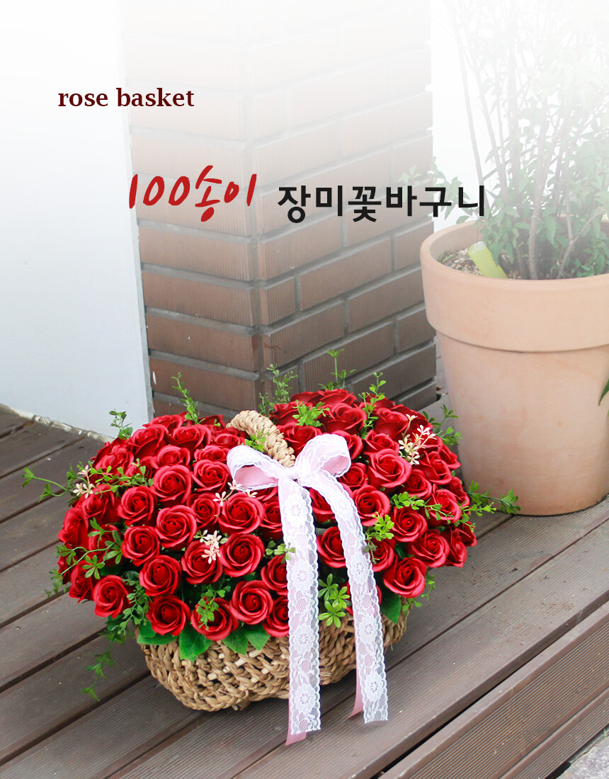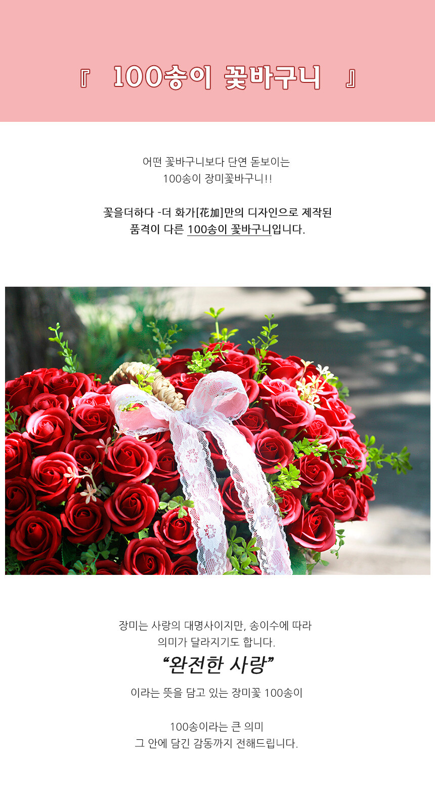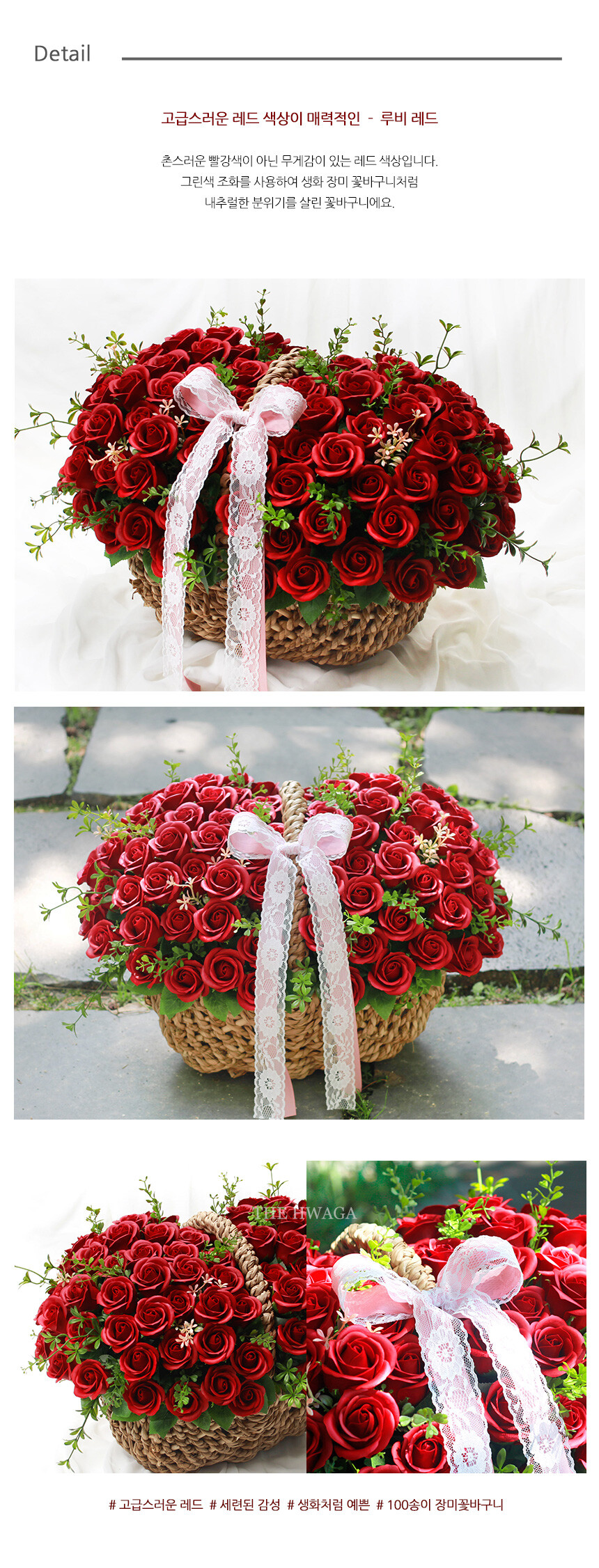 무게감이 있는 레드 컬러 장미를 그린 조화와 함께 어렌지하여 내추럴한 분위기를 잘 살린 100송이 꽃바구니