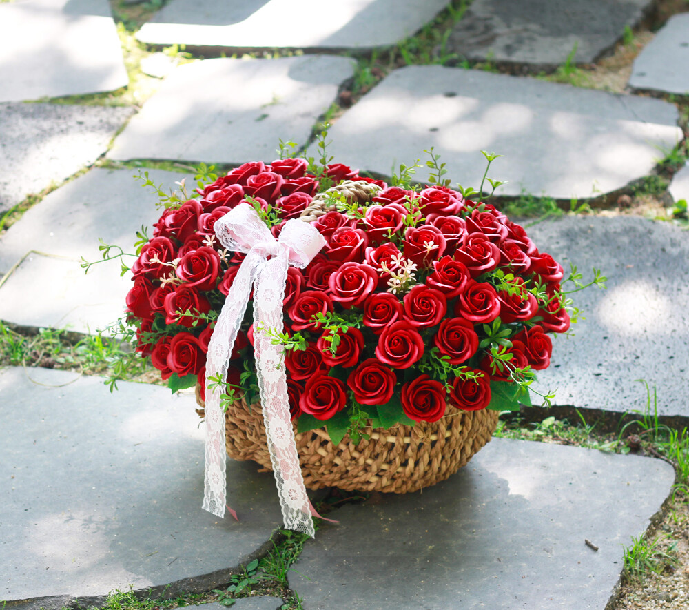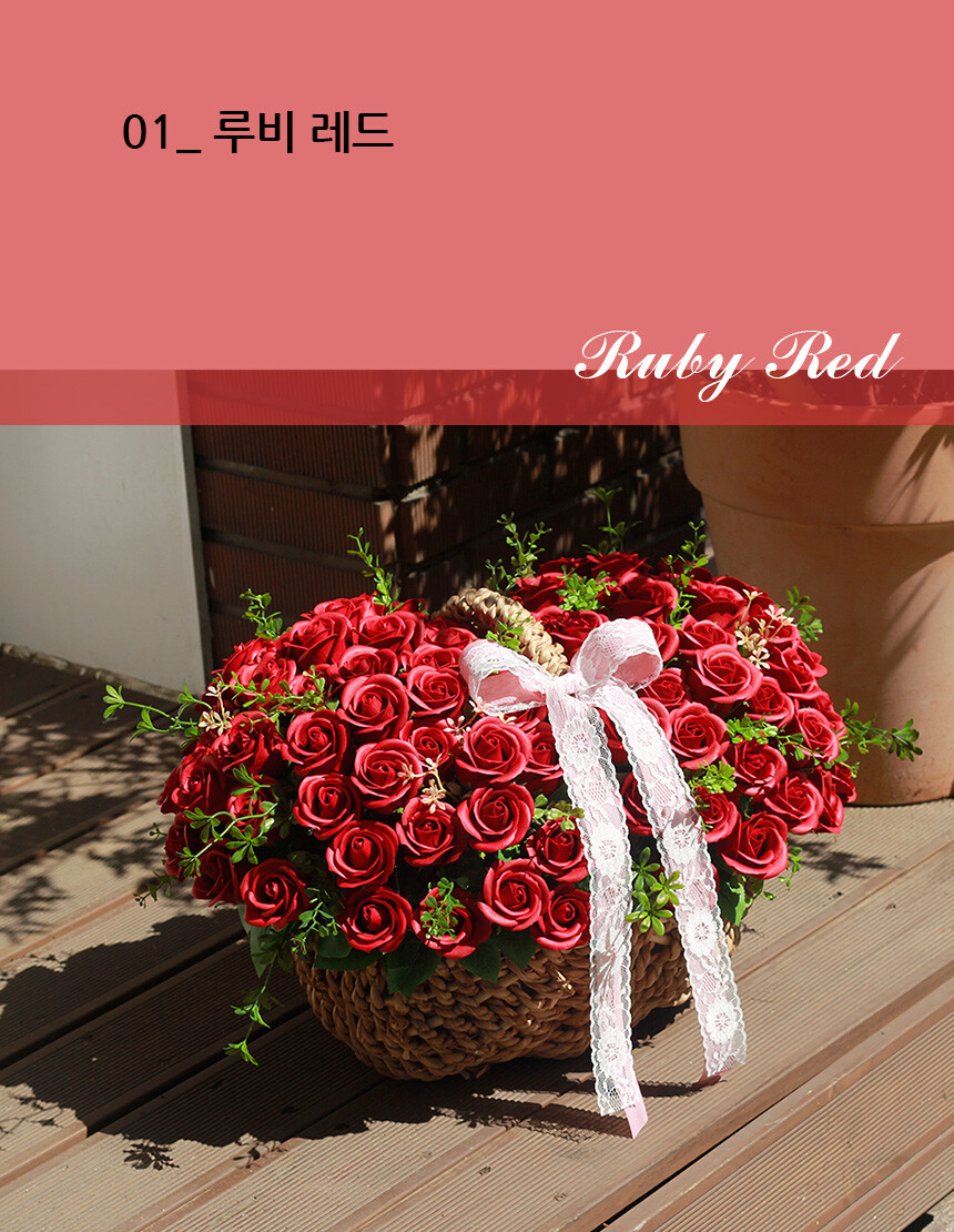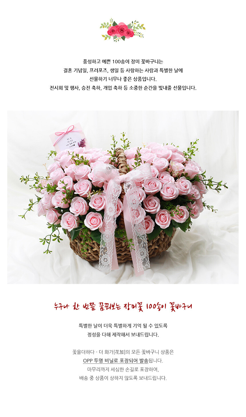 무게감이 있는 레드 컬러 장미를 그린 조화와 함께 어렌지하여 내추럴한 분위기를 잘 살린 100송이 꽃바구니