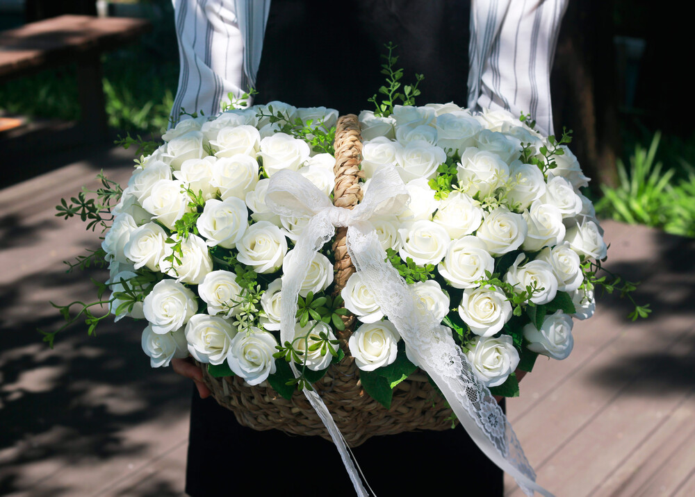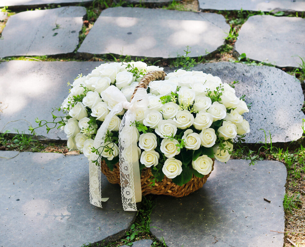 아침 햇살에 반짝이는 눈꽃처럼 새하얀 장미가 너무나 아름다운 100송이 꽃바구니