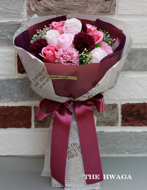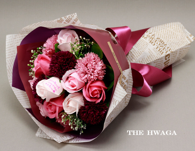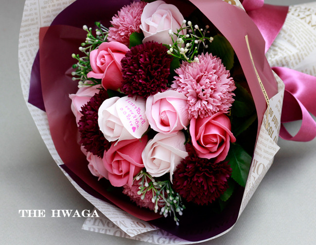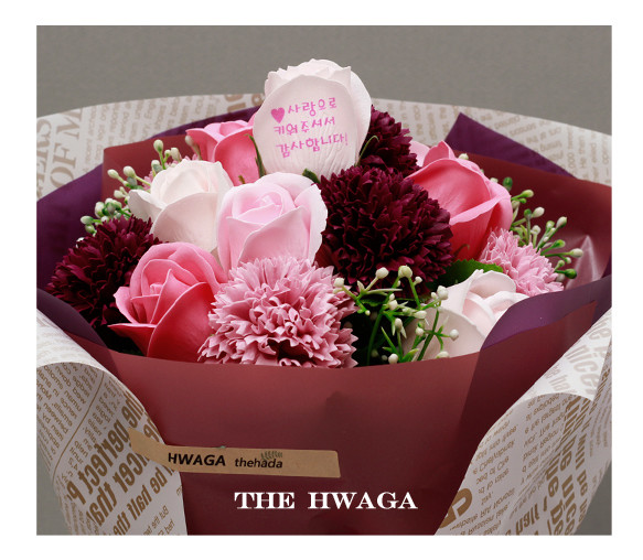 상품구성 : 장미, 카네이션 비누꽃 14송이,메세지비누꽃 1송이(총 15송이),조화 열매, 잎
