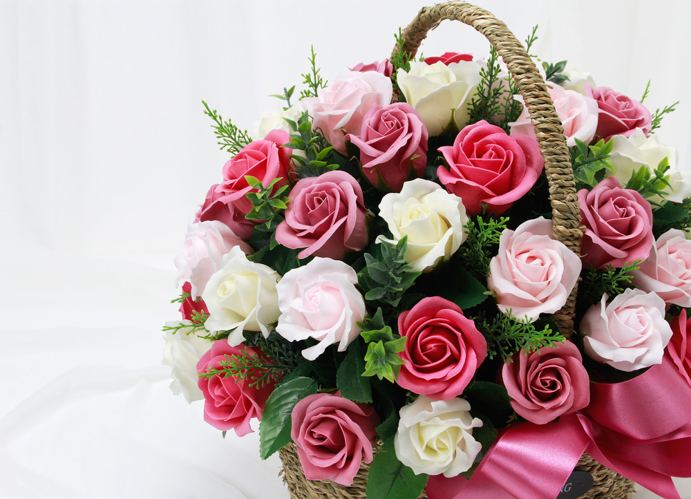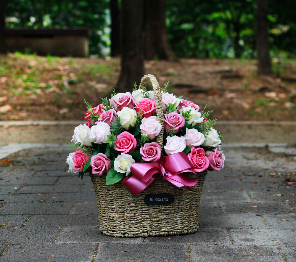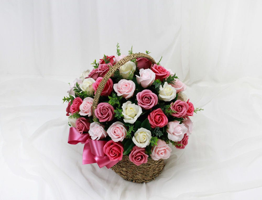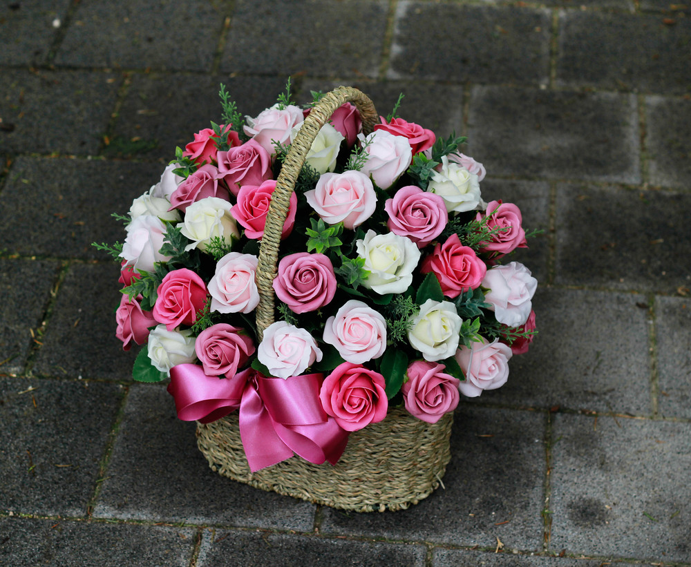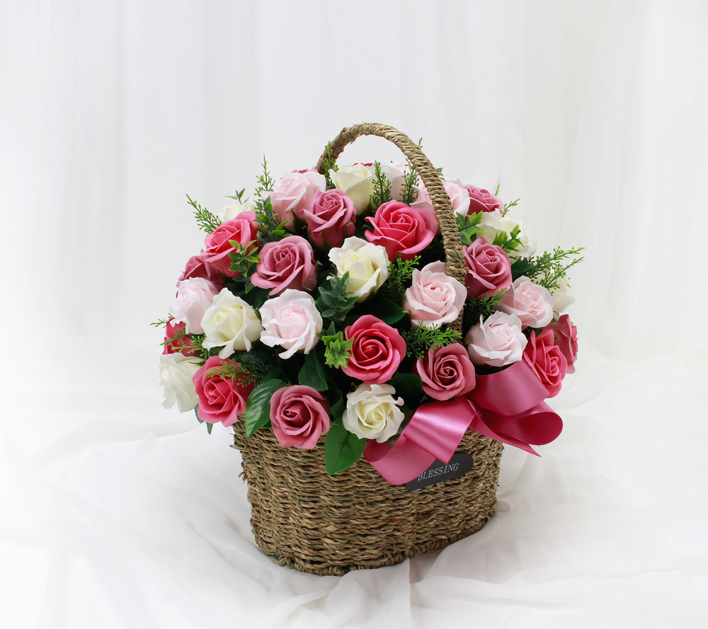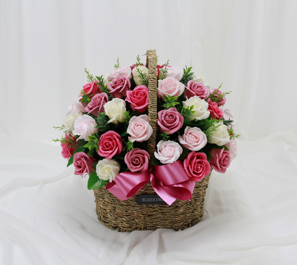 상품구성 : 비누꽃 장미 50송이, 조화 그린소재, 왕골바구니