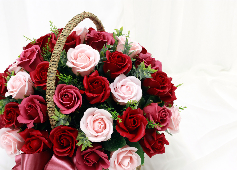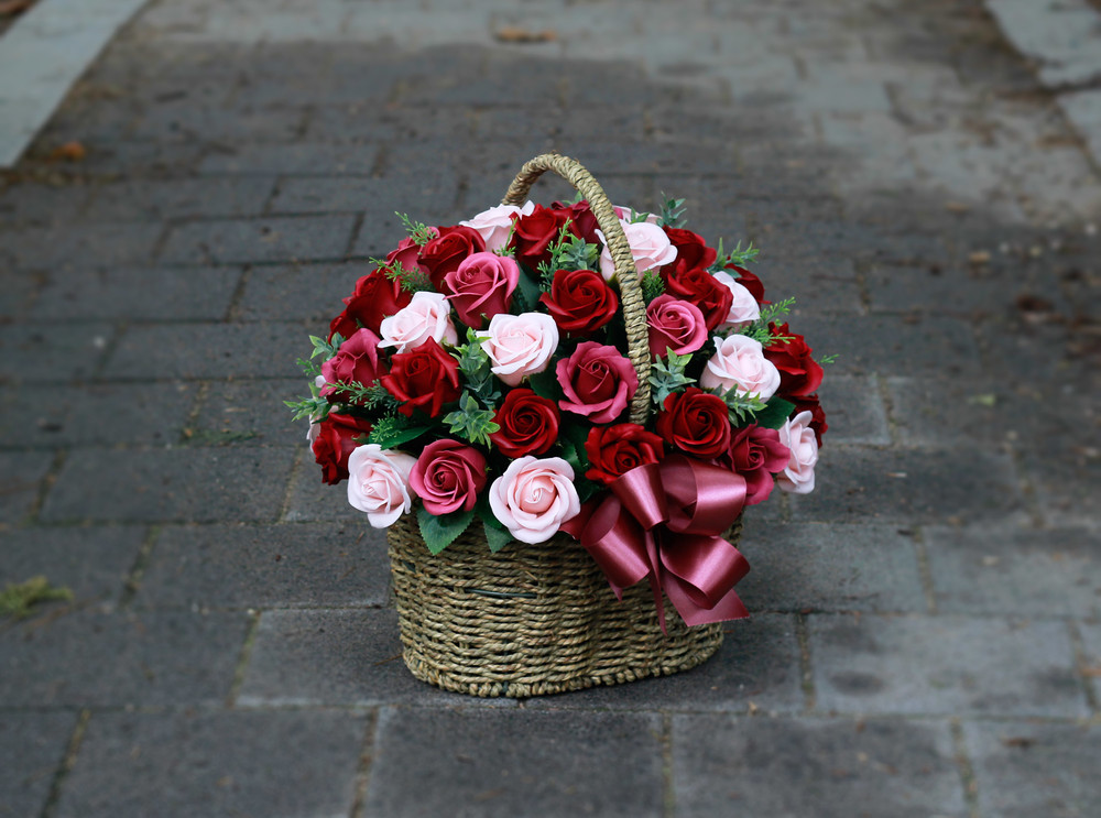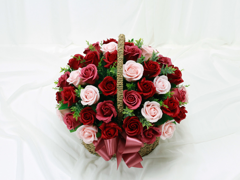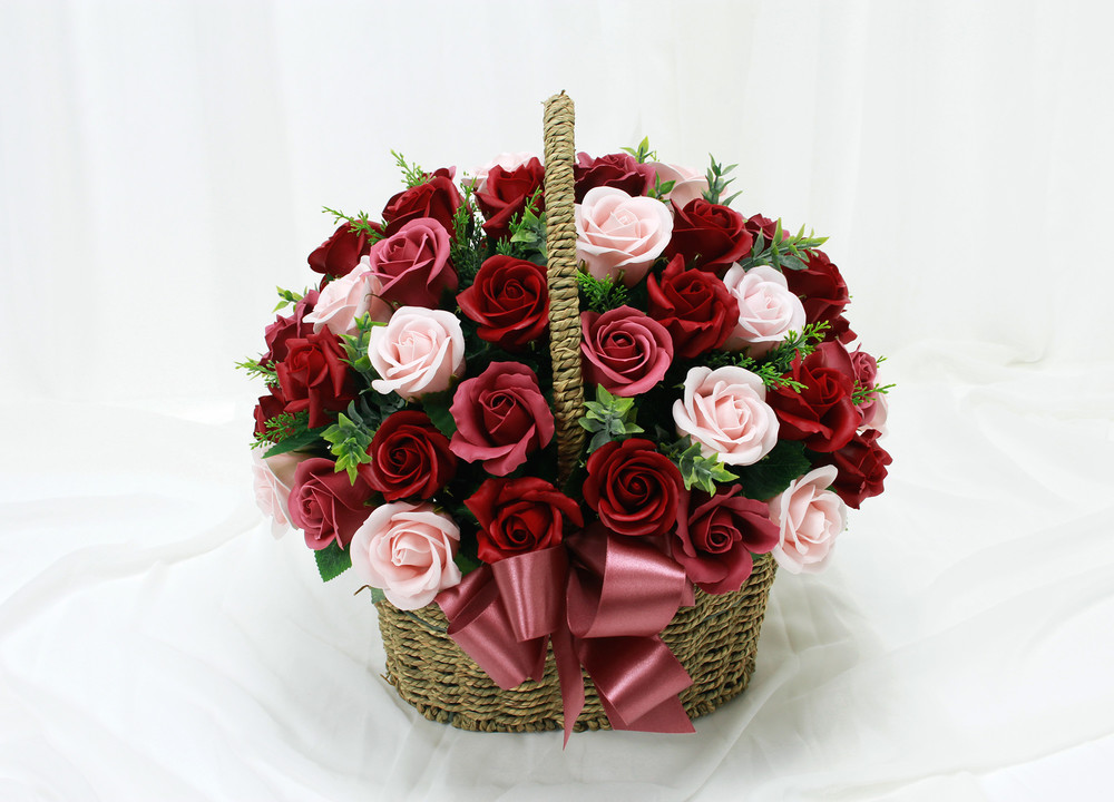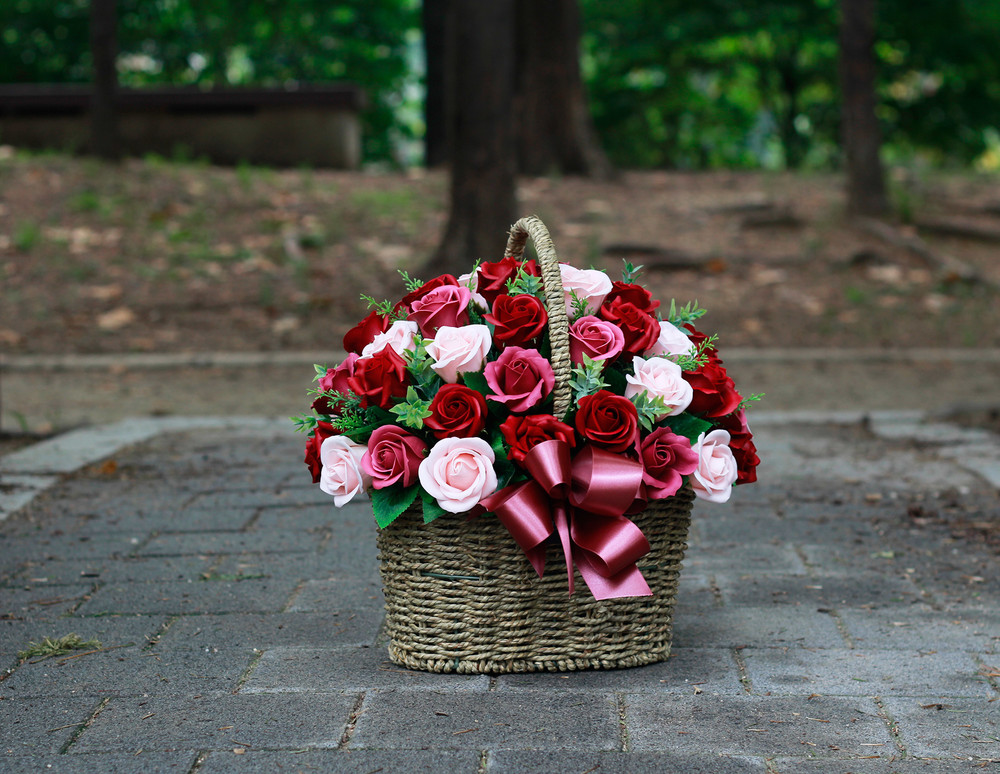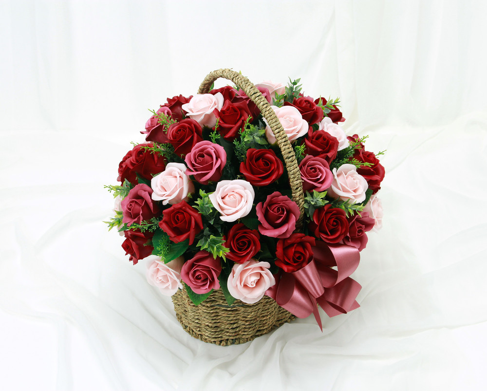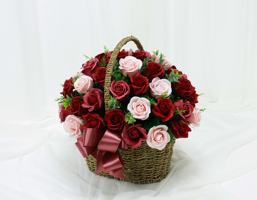 상품구성 : 비누꽃 장미 50송이, 조화 그린소재, 왕골바구니