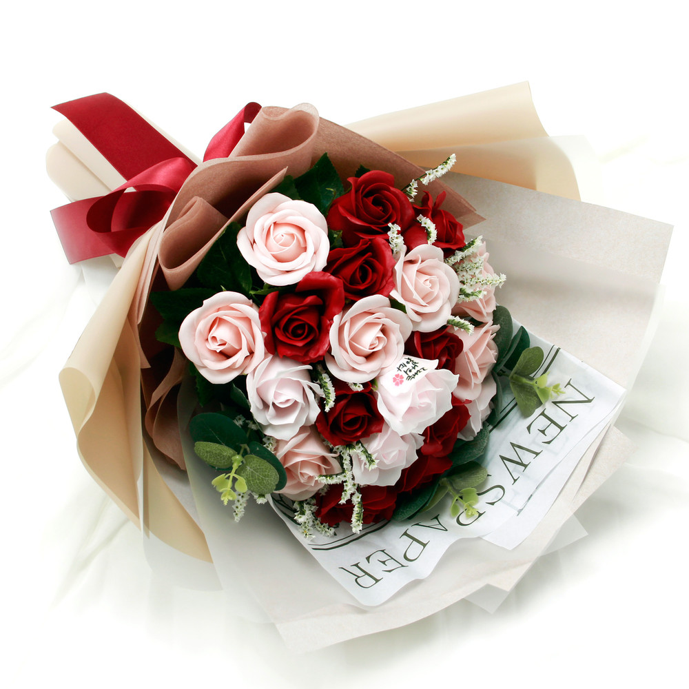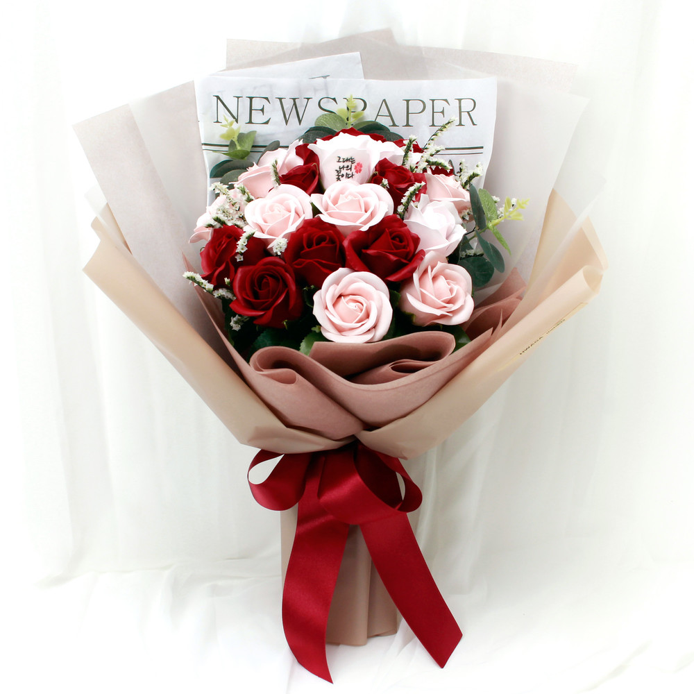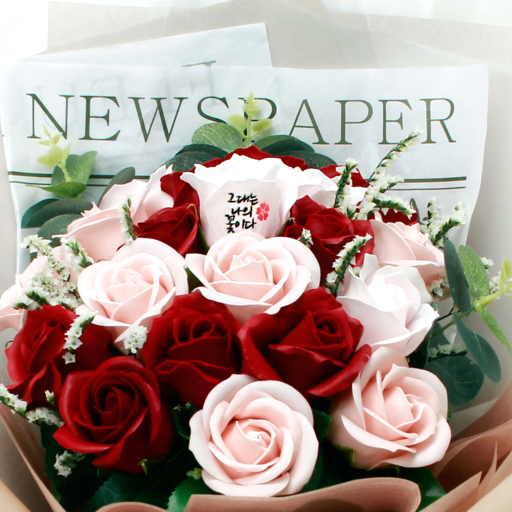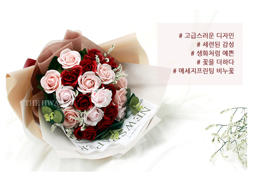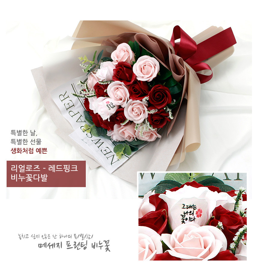 상품구성 : 메세지비누꽃 1송이, 장미비누꽃 19송이, 시네시스(프리저브드), 그린소재