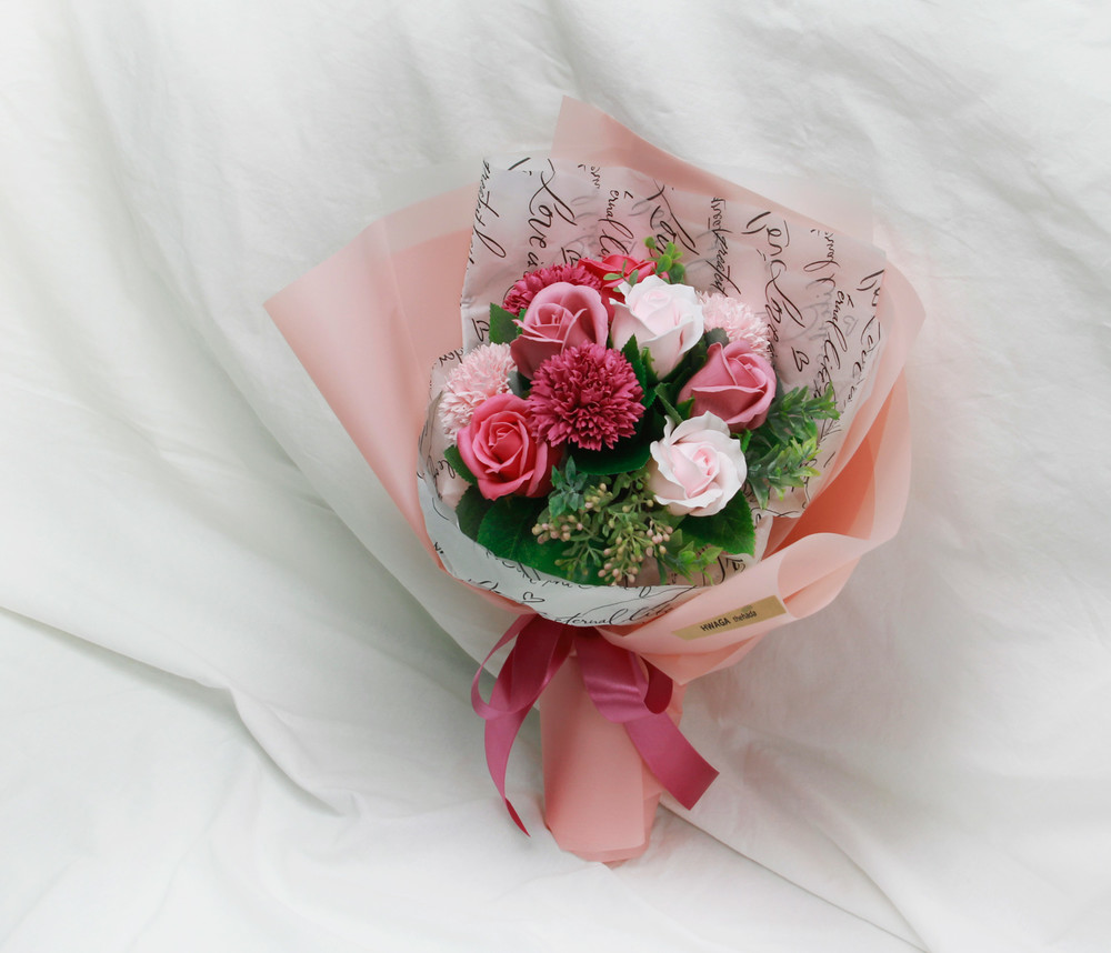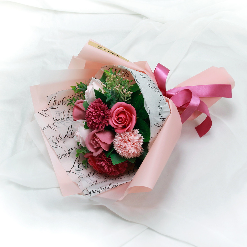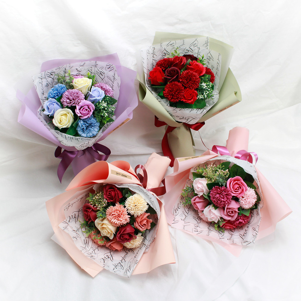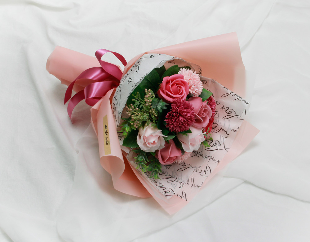 상품구성 : 카네이션 비누꽃 4송이,장미 비누꽃 6송이, 조화 열매, 잎 소재