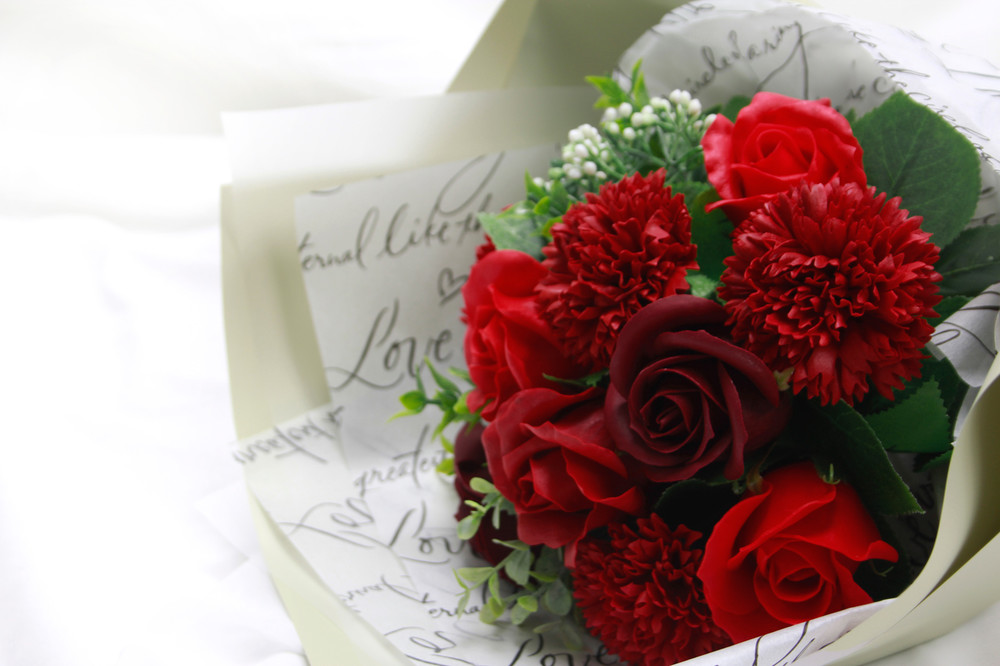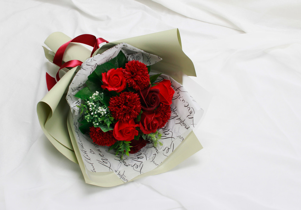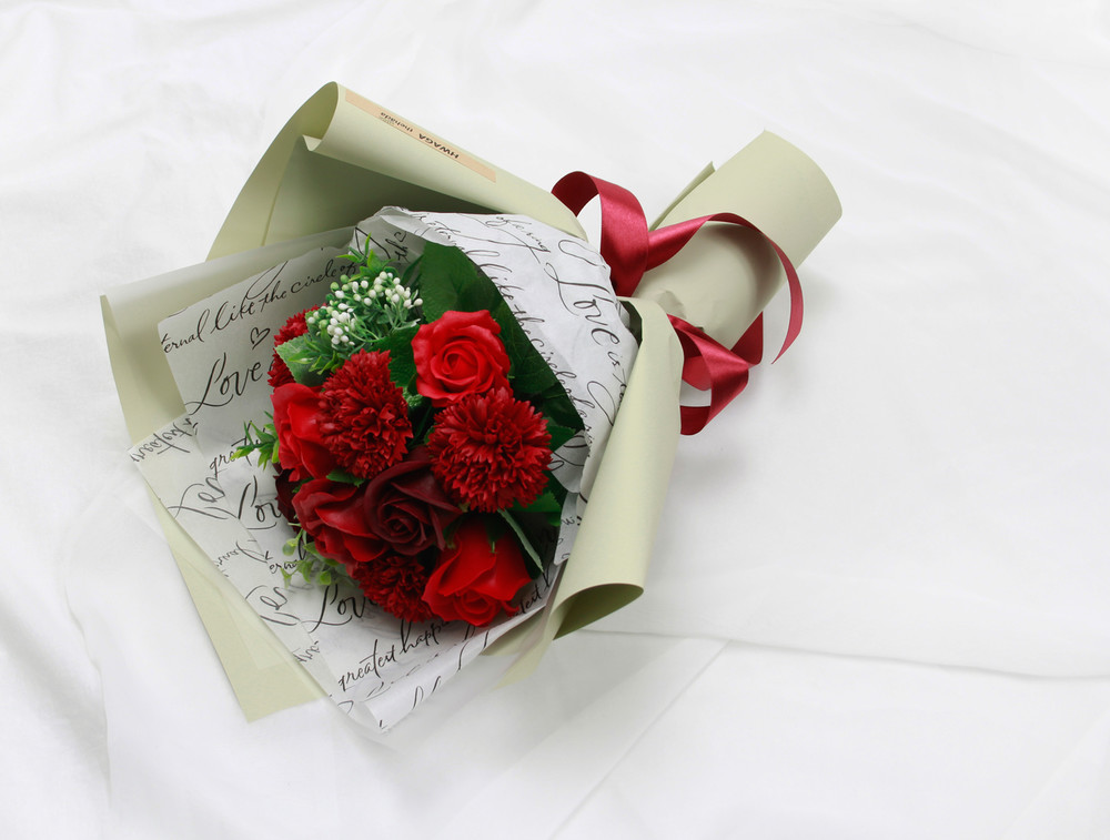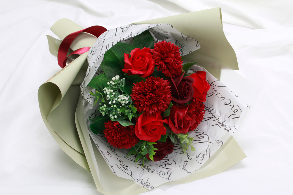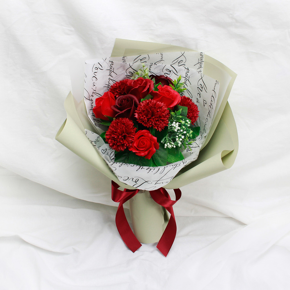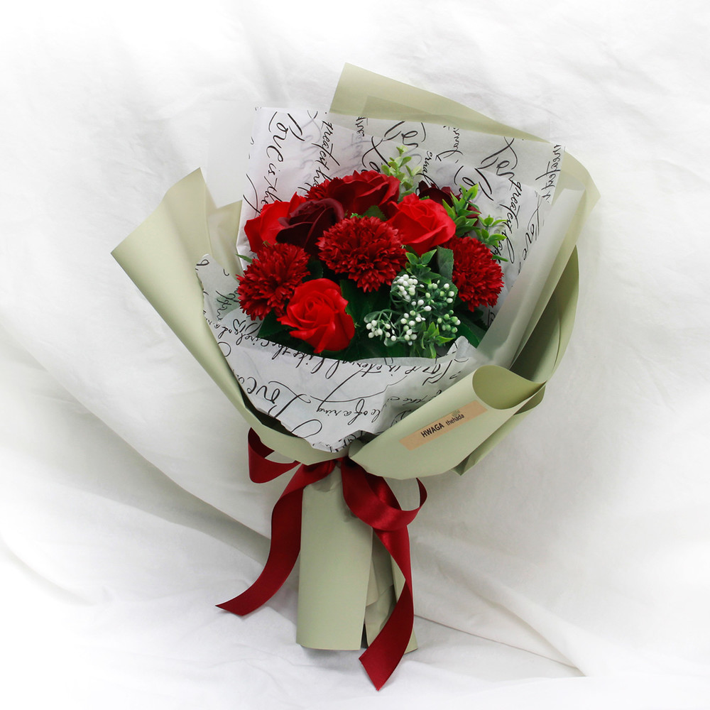 상품구성 : 카네이션 비누꽃 4송이,장미 비누꽃 6송이, 조화 열매, 잎 소재